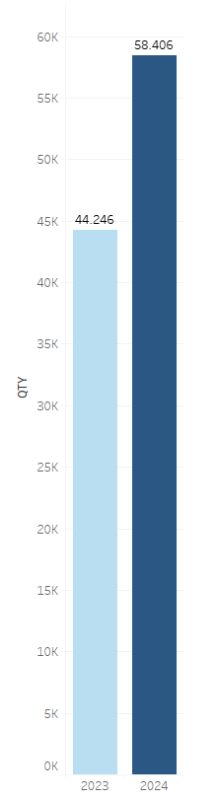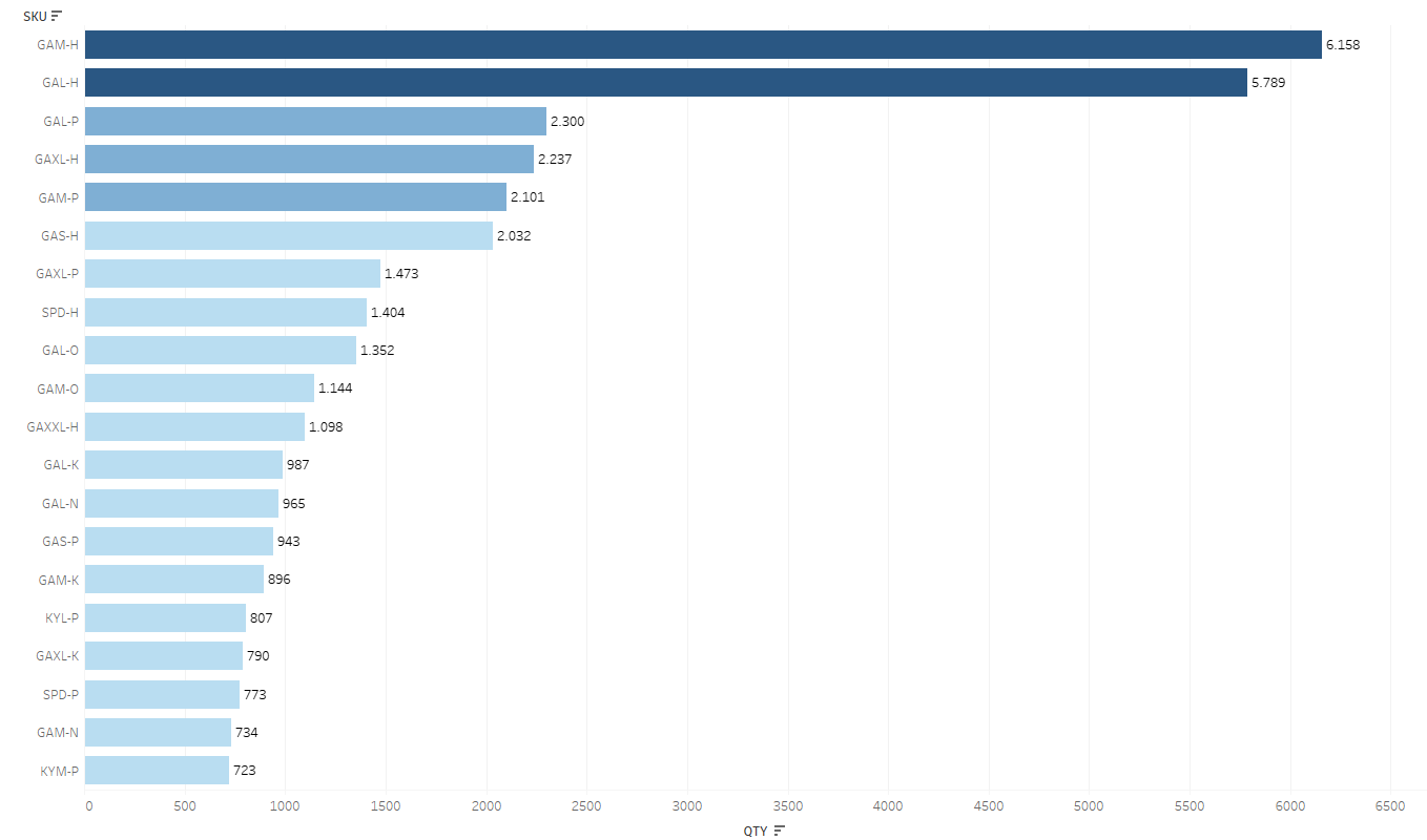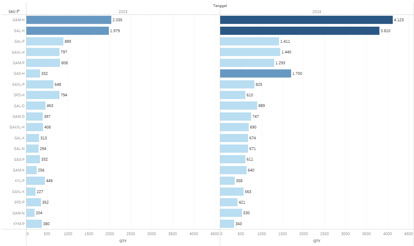 Secara keseluruhan penjualan per SKU di tahun 2024 meningkat, namun ada perbedaan yang sangat signifikan, yaitu penjualan SKU GAS-H tahun 2023 jumlahnya hanya 332 QTY, namun pada tahun 2024 GAS-H terjual sebanyak 1,700 QTY.