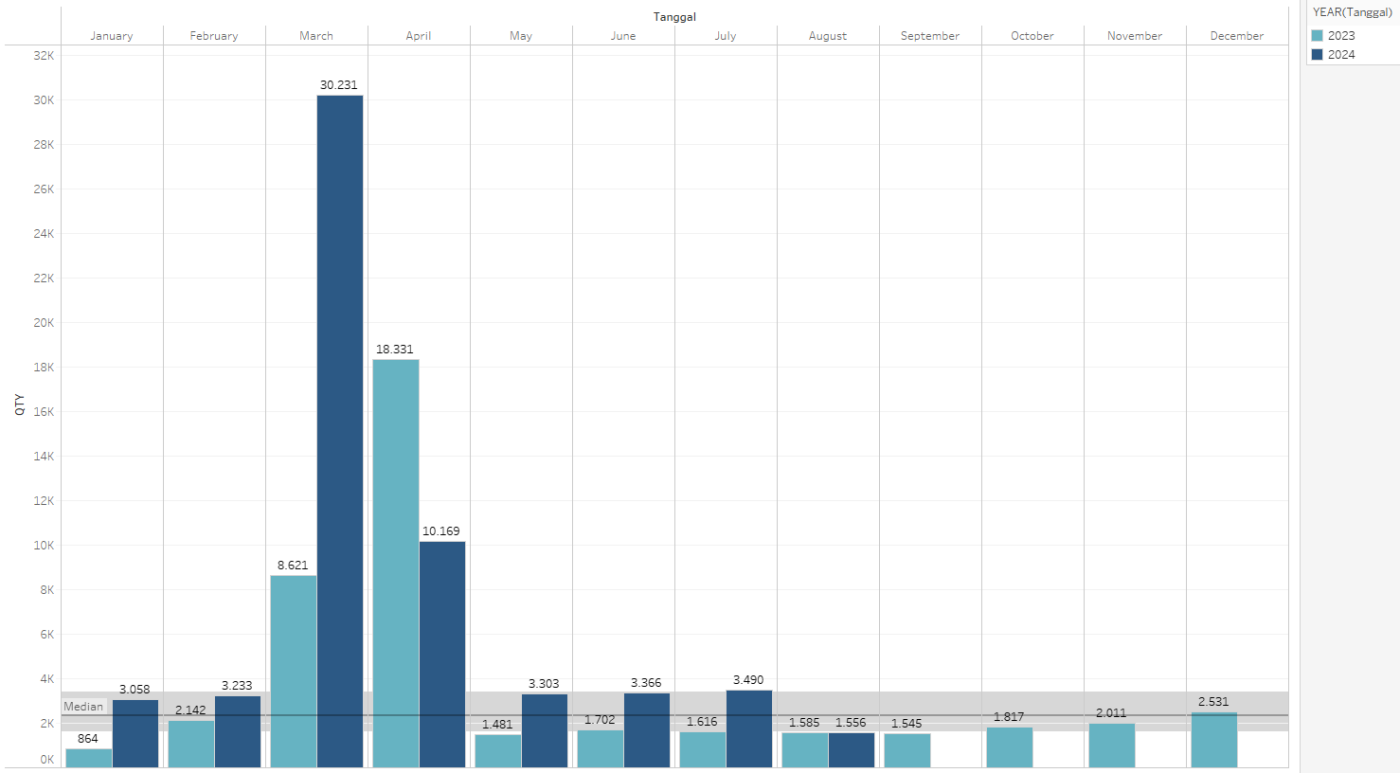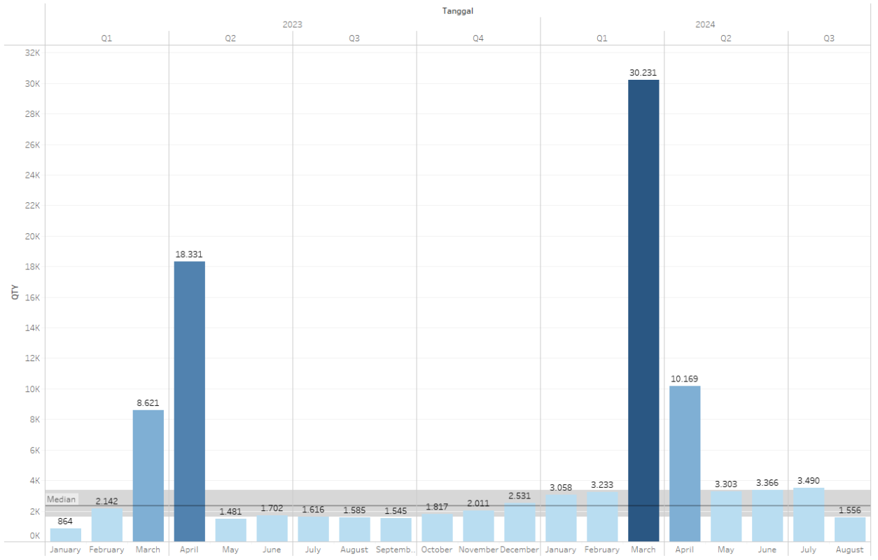 Dapat dilihat dan disimpulkan bahawa penjualan meningkat stabil dari waktu ke waktu, meningkat signifikan di sekitar quartiles median keselurhan table, januari 2023 sebanyak 864 QTY hingga Juli 2024 sebanyak 3,490 (bulan agustus datanya hanya hingga awal bulan). Namun ada peningkatan yang sangat berbeda jelas pada bulan Maret (8,621 QTY) – April (18,831 QTY) tahun 2023, dan juga bulan Maret (30,231) – April (10,169) tahun 2024.