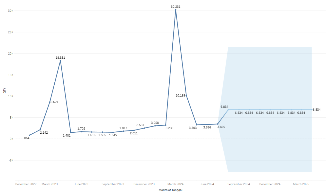 - Forecast Penjualan: Berdasarkan forecast, diperkirakan penjualan QTY akan mencapai 6,834 QTY pada bulan September 2024. Ini menunjukkan bahwa ada potensi peningkatan permintaan yang signifikan di masa depan.